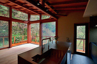 【鎌倉・十二所の家】 都心からの移住先に選ばれた敷地は、目の前に川が流れ、木々に囲まれた静かな場所。屋根の上に緑化を行い、周囲の自然と一体化するような住宅です。水辺には自作のサウナ小屋があります。