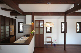 【柏の家】 お母様と暮らすための2世帯住宅です。落ち着いた室内は、格子組の建具や懐かしい雰囲気のガラスなどが使用され、建主さまのこだわりが詰まっています。愛犬との生活も大きなテーマです。