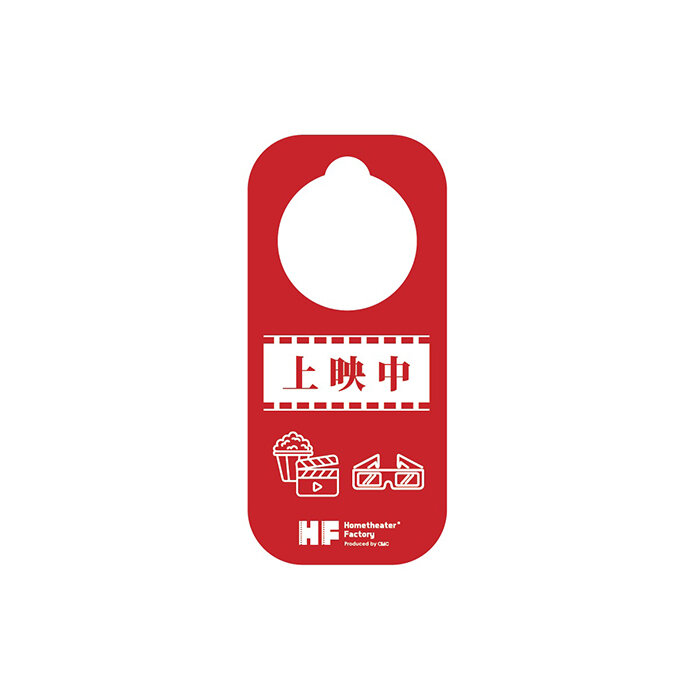 シアタールームをお持ちの方に使っていただけるよう、表に「THEATER ROOM」、裏には「上映中」の文字をあしらいました。