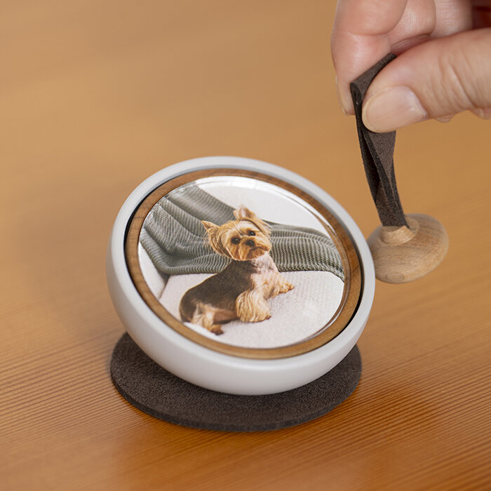 愛しい家族への尽きない想いをそっと包み込む「Tailo」。大切なペットの面影を偲ぶ写真を飾り、見るたびに心温まる記憶が静かによみがえります。優しい音色を生むりん棒は、指でそっと触れるとしっぽを振るようにゆれ、 愛らしいその動きが、家族との絆をいつでも思い出させてくれます。りん棒はペットのイメージに合わせて、5色からお選びいただけます。