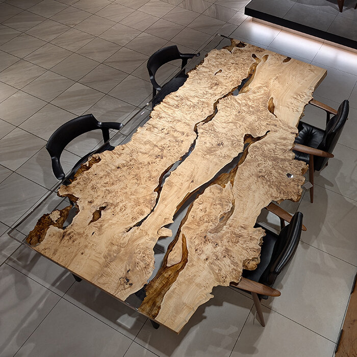 濃い茶色から明るい白まで、複数の色がストライプ状に混じり合うモンキーポッド。 この一枚の中に様々なトーンが含まれているため、ウォールナットのような濃い色の椅子から、オークのような明るい色の家具まで、自然に引き立て合います。 今のインテリアを活かしつつ、空間を一段引き上げてくれる一枚です。
