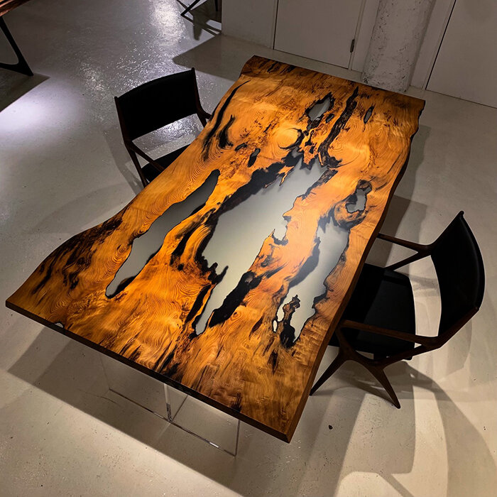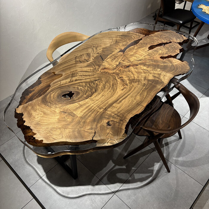 圧倒的な奥行きと重厚感を誇る、ポプラの一枚板です。 荒々しくも美しいポプラ特有の木目を活かし、天然の割れ部分には丁寧にレジンを施しました。 無垢材が持つ本来の躍動感を損なうことなく、フラットな実用性を両立しています。 力強い生命力と現代的な造形美が共存する、空間の主役にふさわしい風格ある一枚です。