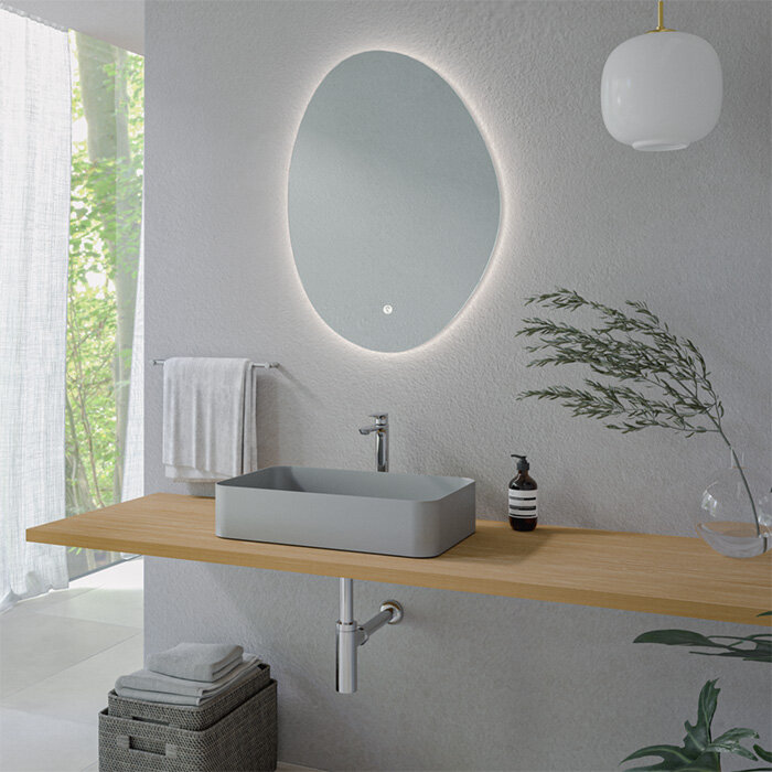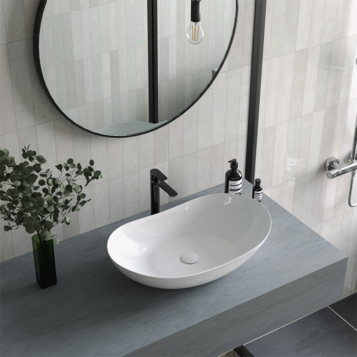 両端が優雅に立ち上がるボウル形状は、洗面空間にモダンで洗練された雰囲気をもたらし、ゆるやかに波打つフォルムと繊細なエッジが光を受け、陶器の艶と陰影を美しく映し出します。 中央部に適度な深さを持たせることで、洗顔や手洗い時に水が外へ飛び散るのを効果的に抑えます。